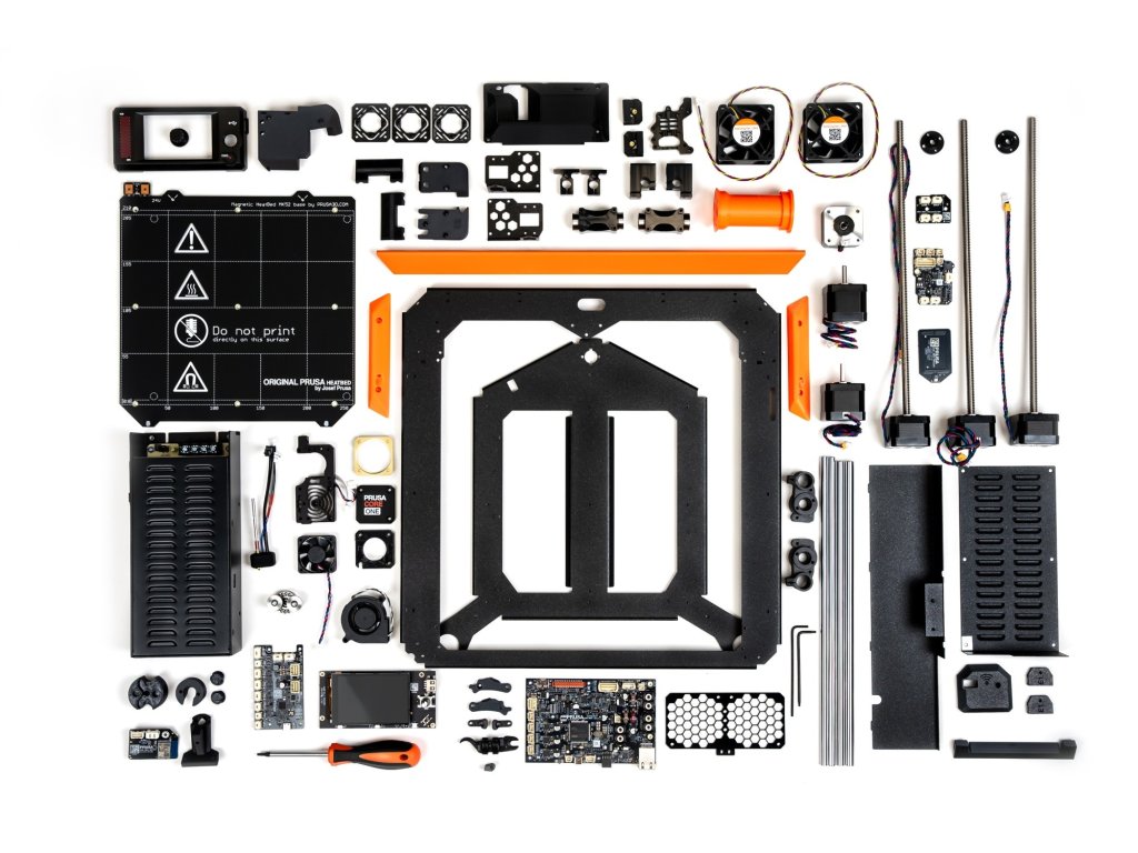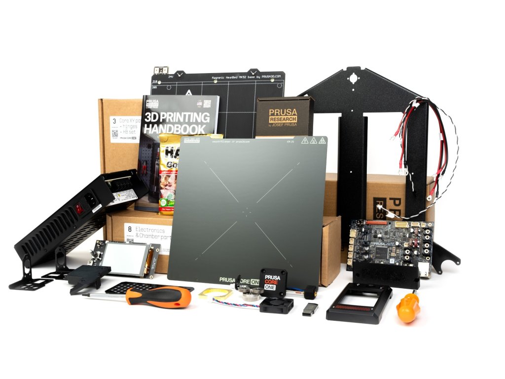 Obsah balení: Stavebnice 3D tiskárny Prusa CORE One+, Ocelový tiskový plát s hladkým PEI povrchem, Příručka pro 3D tiskaře, USB disk se vzorovými výtisky (G-kódy), Alkoholem napuštěné ubrousky, akupunkturní jehla, 2x 25g vzorek ložiska, Sada nástrojů: Klíč, klíč 13-16, kleště, imbusové a torxové klíče.