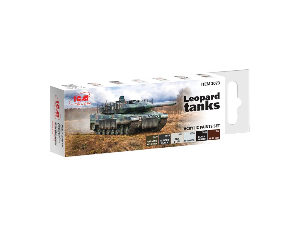 Sada 6 modelářských akrylových barev značky ICM určená pro nabarvení nebo nastříkání modelů tanků Leopard ze současnosti.