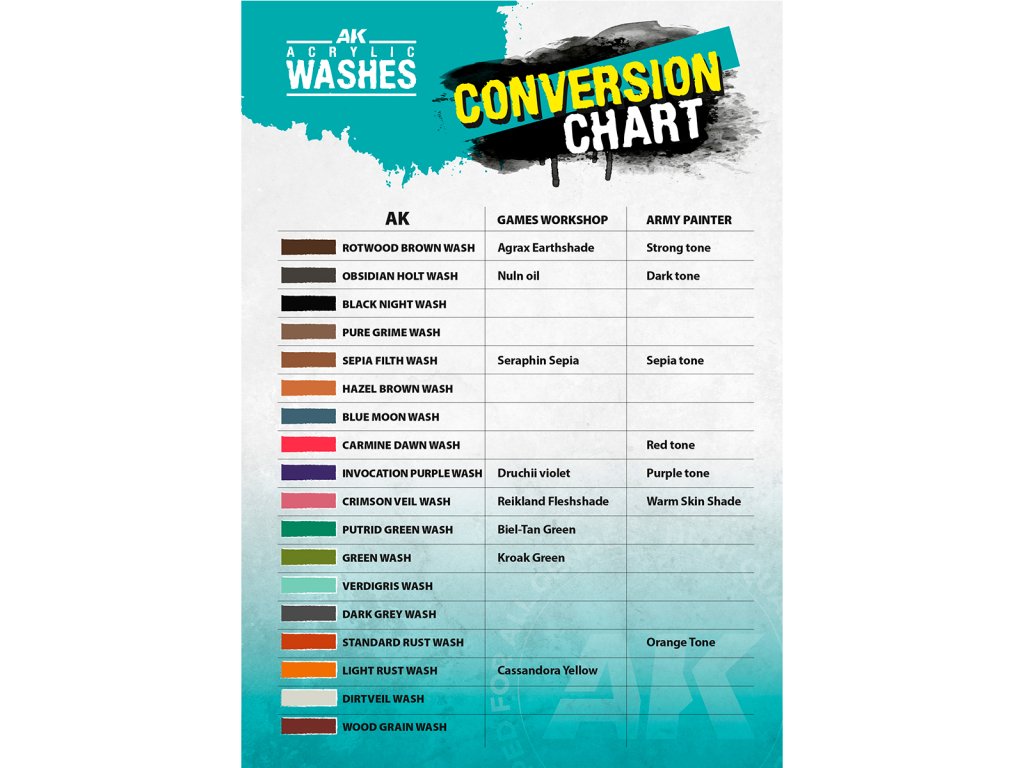 Výhodou akrylového washu je, že není toxický a je bez zápachu. Zároveň schne rychleji než washe typu enamel, což vám umožňuje dokončit proces weatheringu v kratším čase. Jsou určeny k nanášení jemným štětcem přímo z lahvičky tak, aby se korigovalo nadměrné nahromadění na jednom místě, které může způsobit gravitace. Povrch je po vyschnutí matný a přebytečné zbytky washu lze odstranit pomocí vody nebo akrylového ředidla.