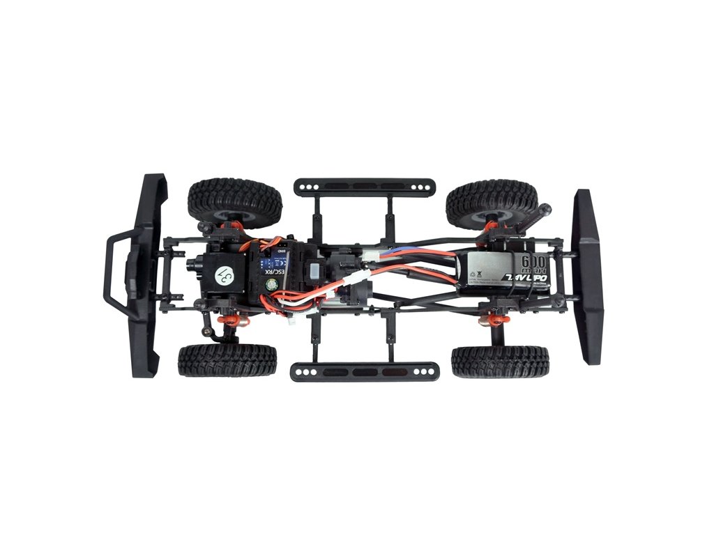 Jako drobná zvláštnost má ovladač ve standardu dva přídavné výstupy, například pro připojení střešního osvětlení nebo FPV kamery. Kabely jsou již vybaveny konektorem Micro JST a nainstalovány připraveny k připojení. Šnorchl na karoserii a mnoho dalších realistických detailů ještě více podtrhují robustní charakter vozu. Přibalená LiPo baterie 2S 7,4V 600mAh zajišťuje dlouhou dobu jízdy až 15 minut. Tato komerčně dostupná baterie je vyměnitelná, má silový konektor Molex a balancovací XH.