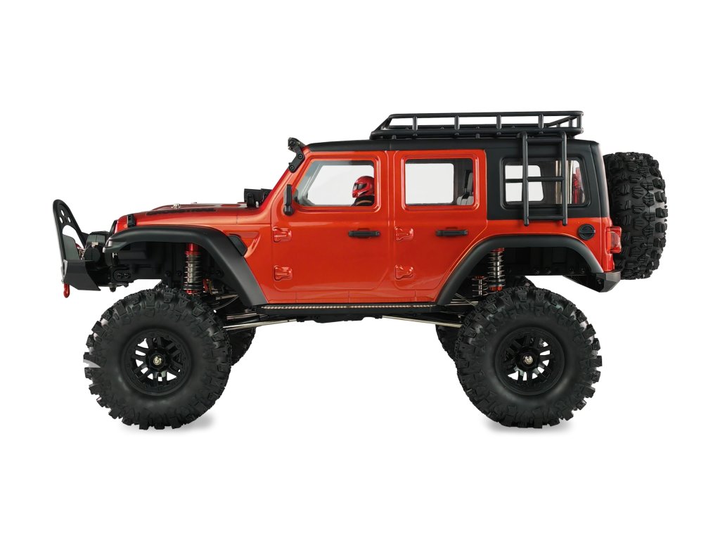 Obsah balení: Sestavený model RC crawleru, 2,4 GHz 6-kanálové dálkové ovládání, doplňky, manuál EN/DE