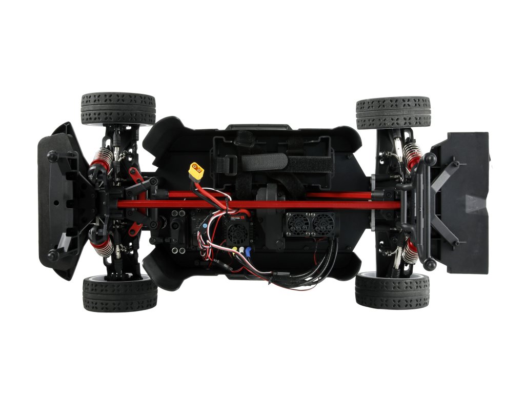 Vysoce kvalitní dálkové ovládání nabízí komplexní možnosti nastavení, jako je například dual rate řízení a plynu, včetně plynulého nastavení koncových bodů a maximální rychlosti. Vodotěsná skříňka a stejně chráněné digitální servo řízení dělají model vhodným pro neomezené venkovní použití téměř na jakémkoli povrchu. Součástí balení je také výkonný akumulátor Li-Pol 4S 5000mAh/14,8V 35C a nabíječka.