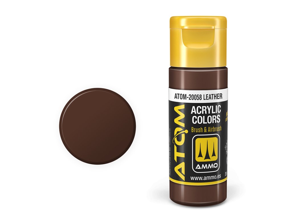 Nová revoluční série modelářských akrylových barev ATOM by AMMO, která spojuje 20 leté zkušenosti s barvami do jedné 20ml lahvičky. Barvy lze použít k malování a stříkání všech typů modelů nebo diorám, bez ohledu na jejich materiál, ať už je to plast, pryskyřice, fotolepty, kov, dřevo, pěna, tmel apod. Jsou ideální pro použití na modely, jako jsou vojenská vozidla, letadla, civilní vozidla, železniční modely, sci-fi, lodě, ponorky, diorámy, figurky, wargamingové a stolní hry a dokonce i modely na dálkové ovládání a autodráhová autíčka.