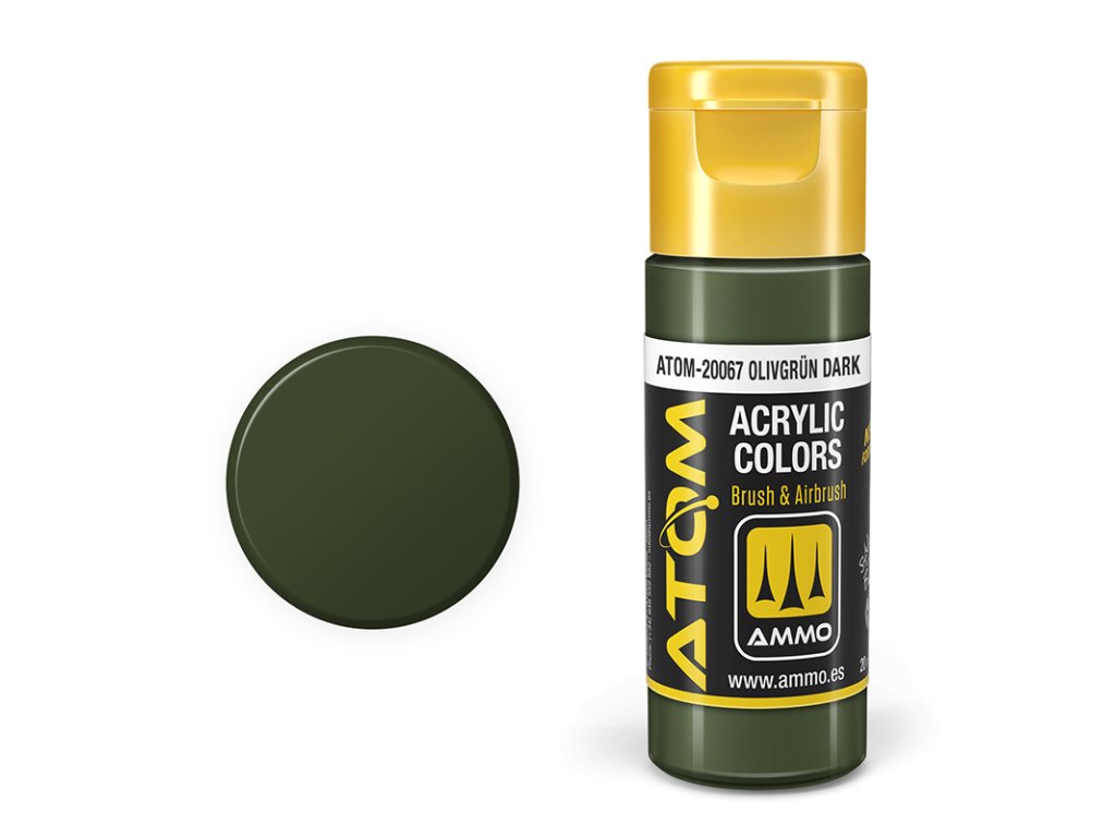 Nová revoluční série modelářských akrylových barev ATOM by AMMO, která spojuje 20 leté zkušenosti s barvami do jedné 20ml lahvičky. Barvy lze použít k malování a stříkání všech typů modelů nebo diorám, bez ohledu na jejich materiál, ať už je to plast, pryskyřice, fotolepty, kov, dřevo, pěna, tmel apod. Jsou ideální pro použití na modely, jako jsou vojenská vozidla, letadla, civilní vozidla, železniční modely, sci-fi, lodě, ponorky, diorámy, figurky, wargamingové a stolní hry a dokonce i modely na dálkové ovládání a autodráhová autíčka.