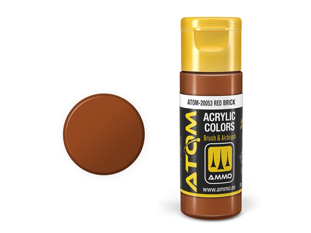 Nová revoluční série modelářských akrylových barev ATOM by AMMO, která spojuje 20 leté zkušenosti s barvami do jedné 20ml lahvičky. Barvy lze použít k malování a stříkání všech typů modelů nebo diorám, bez ohledu na jejich materiál, ať už je to plast, pryskyřice, fotolepty, kov, dřevo, pěna, tmel apod. Jsou ideální pro použití na modely, jako jsou vojenská vozidla, letadla, civilní vozidla, železniční modely, sci-fi, lodě, ponorky, diorámy, figurky, wargamingové a stolní hry a dokonce i modely na dálkové ovládání a autodráhová autíčka.