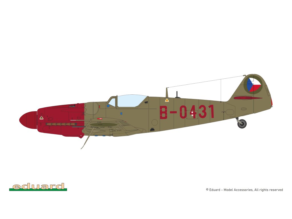 Stavebnice plastikového modelu československého jednomotorového stíhacího letadla s novějším odsuvným překrytem kokpitu.