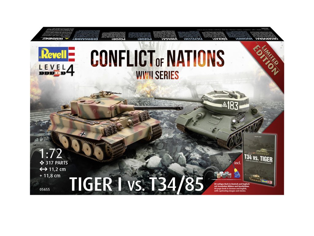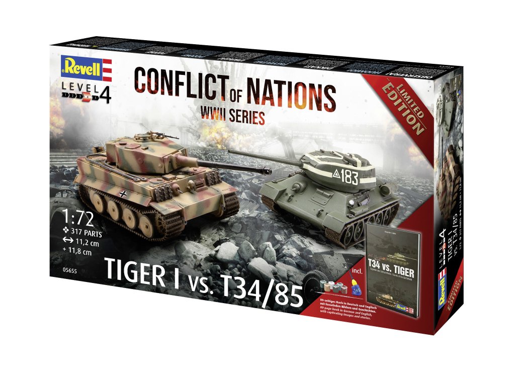 Stavebnice plastikového modelu sady dvou legendárních tanků z druhé světové války. Stavebnice obsahuje díly pro stavbu tanků T-34/85 a Tiger I, lepidlo, sadu štětců, základní barvy a 80 stranovou knihu obsahující řadu historických faktů a detailů o obou tancích.