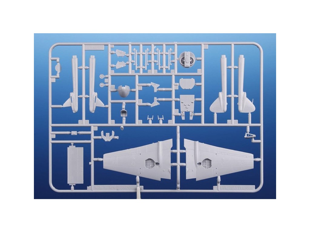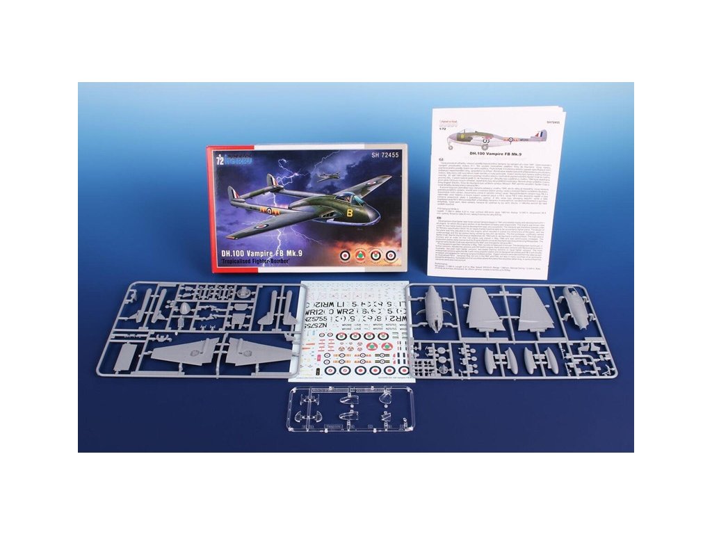 Stavebnice plastikového modelu britské proudové stíhačky první generace. DH.100 Vampire byla produkována v několika verzích pro RAF i na export. Verze Vampire Mk.9 byla upravena pro službu v tropech. Dostala do zvětšeného kořene pravého nasavače klimatizační jednotku. Protože byla určena k bojovým útokům, byla vybavena závěsy pro podvěšenou výzbroj. Kromě RAF a RNZAF se dostala do výzbroje dalších letectva, exportní verze byla označována FB.52.