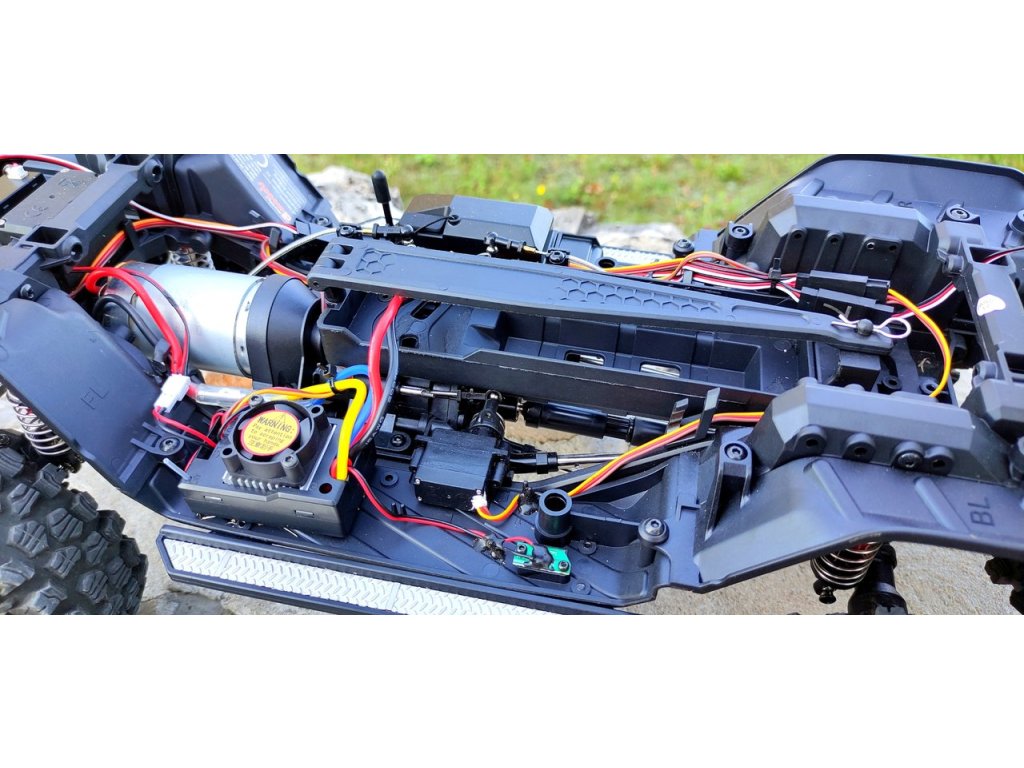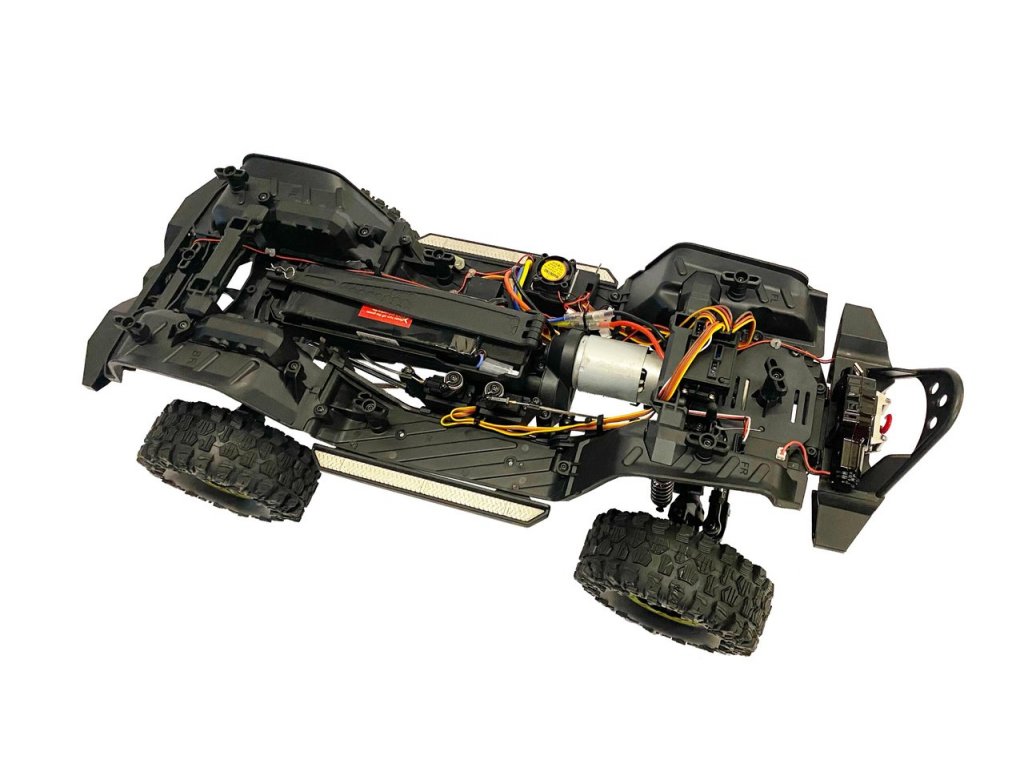 Klasická osvědčená konstrukce šasi zajišťuje dostatečnou tuhost a zároveň velký výkyv náprav při zdolávání překážek. Olejové tlumiče mají matice pro nastavení tuhosti pružin. Servo řízení je dostatečně silné a má kovové převody. Výrobce deklaruje voděodolnost vůči stříkající vodě. Středová převodovka umožňuje pomocí serva nastavit jeden ze dvou převodových poměrů a zvolit tak rychlost modelu na rovině nebo vysoký točivý moment v obtížném terénu. LED světla (včetně blinkrů a brzdových) jsou nainstalována a dálkově ovládána.