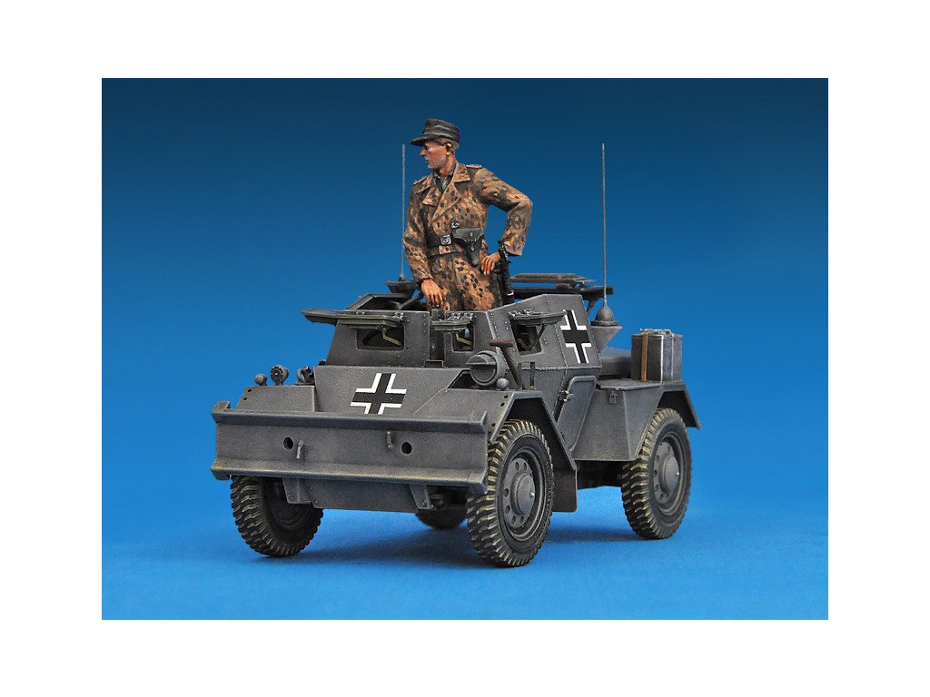 Stavebnica plastového modelu nemeckého obrneného auta z obdobia 2. sv. vojny.