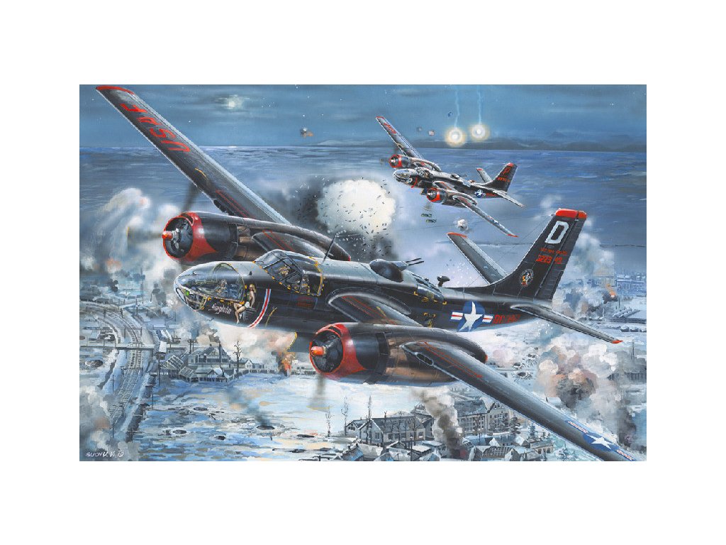 Stavebnice plastikového modelu výkonného amerického dvoumotorového bombardovacího a útočného letadla, které sloužilo ještě dlouho po skončení 2. světové války a bojovalo také v Korejské válce. Stavebnice obsahuje kovové díly a pryžové pneumatiky.