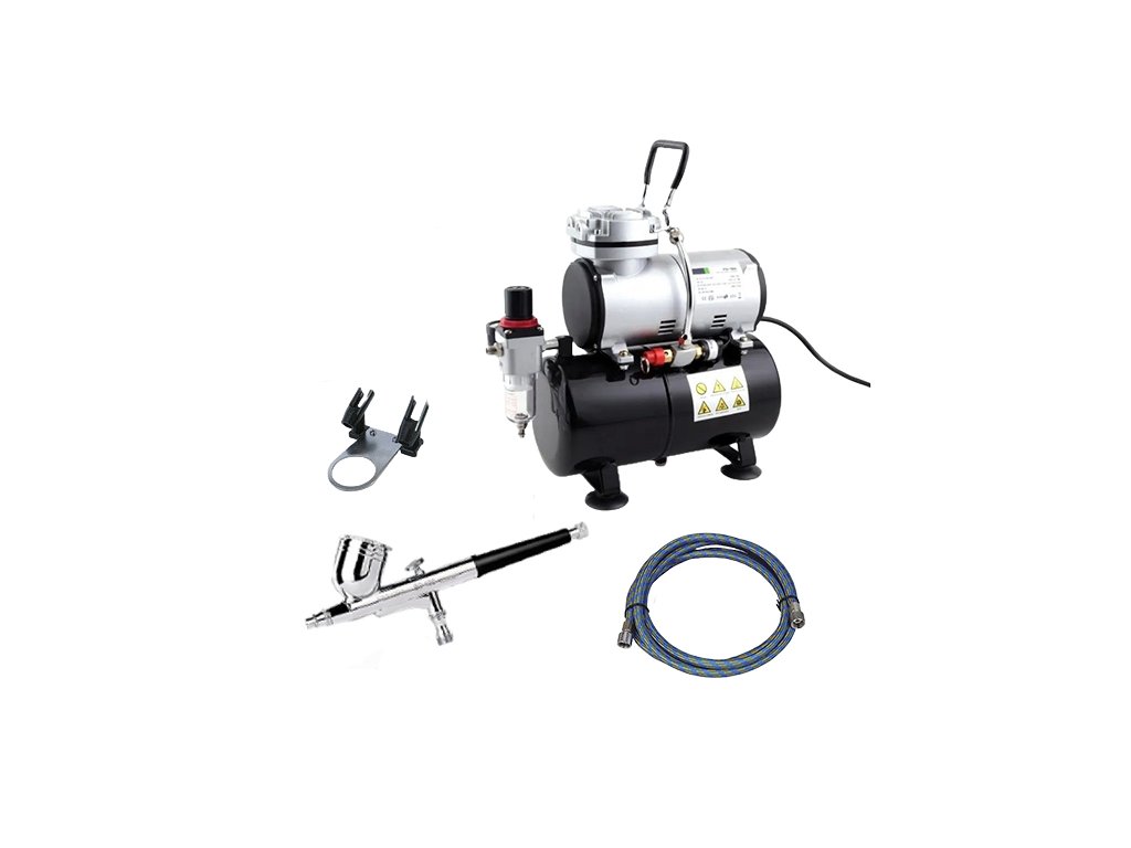 Zdroj vzduchu - kompresor: Pracovní tlak stříkacích pistolí se pohybuje mezi 0,8 – 2,7 bar, v závislosti na druhu pistole a práce. Kompresor musí mít plynulou regulaci tlaku a odlučovací filtr pro zachycení nečistot a vodních par. Některé kompresory pro airbrush mají tlakovou nádobu (vzdušník), sloužící pro co nejrovnoměrnější tlak vzduchu na výstupu.