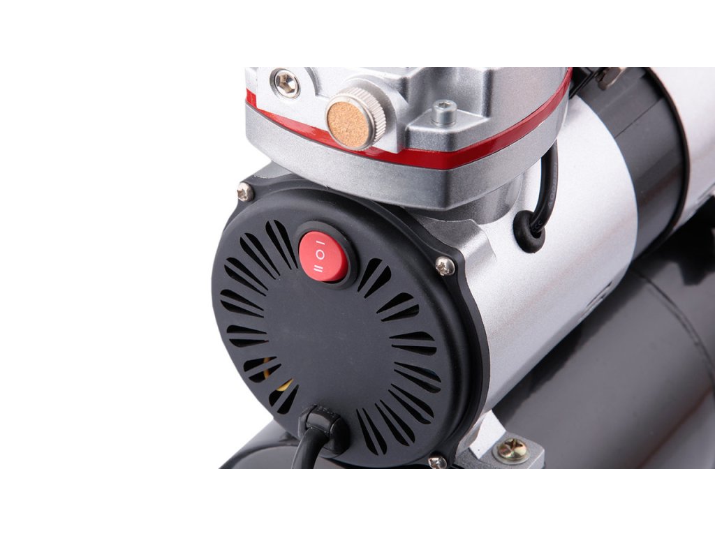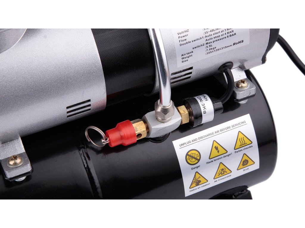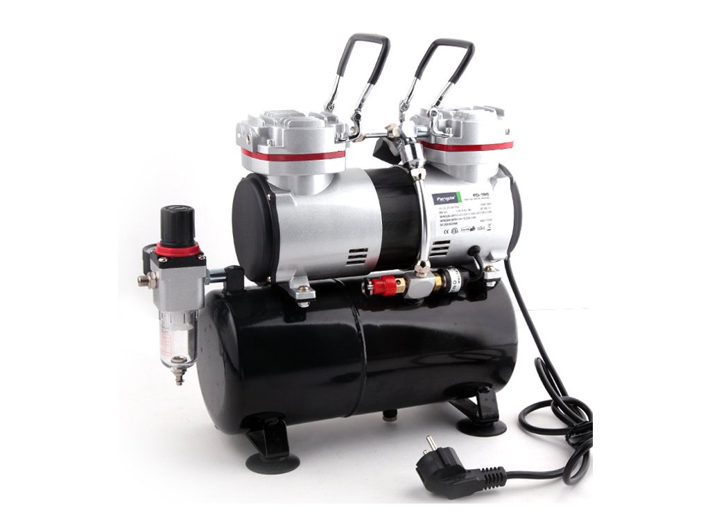 Jednopístový bezolejový kompresor s tlakovou nádobou a regulátorem výstupního tlaku, filtrem a manometrem (tlakoměrem). Po dosažení požadovaného tlaku se sám vypne. Opět se zapne, když tlak klesne pod nastavenou úroveň. Vhodný pro airbrush s tryskami od 0,2 do 1 mm.