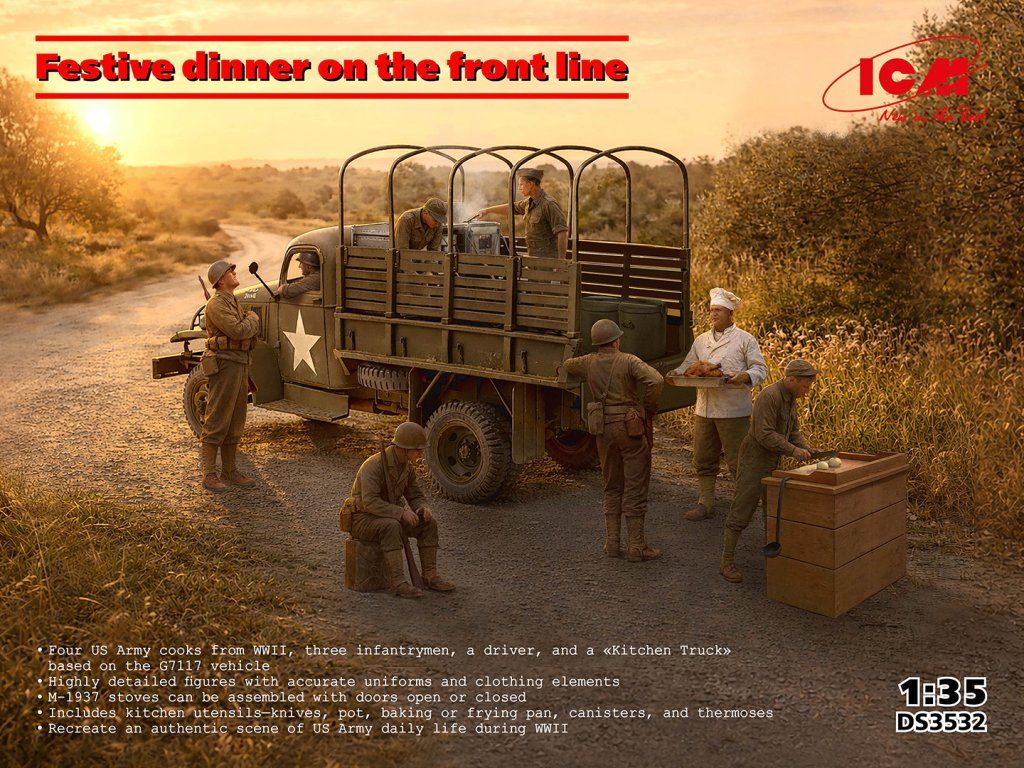 Stavebnice plastikového modelu amerického nákladního automobilu používaného jako polní kuchyně během 2. světové války. Součástí stavebnice jsou díly pro stavbu polních kamen M-1937, příbory, hrnce a pánve, jakož i figurky kuchařů, řidiče a tři pěšáky.