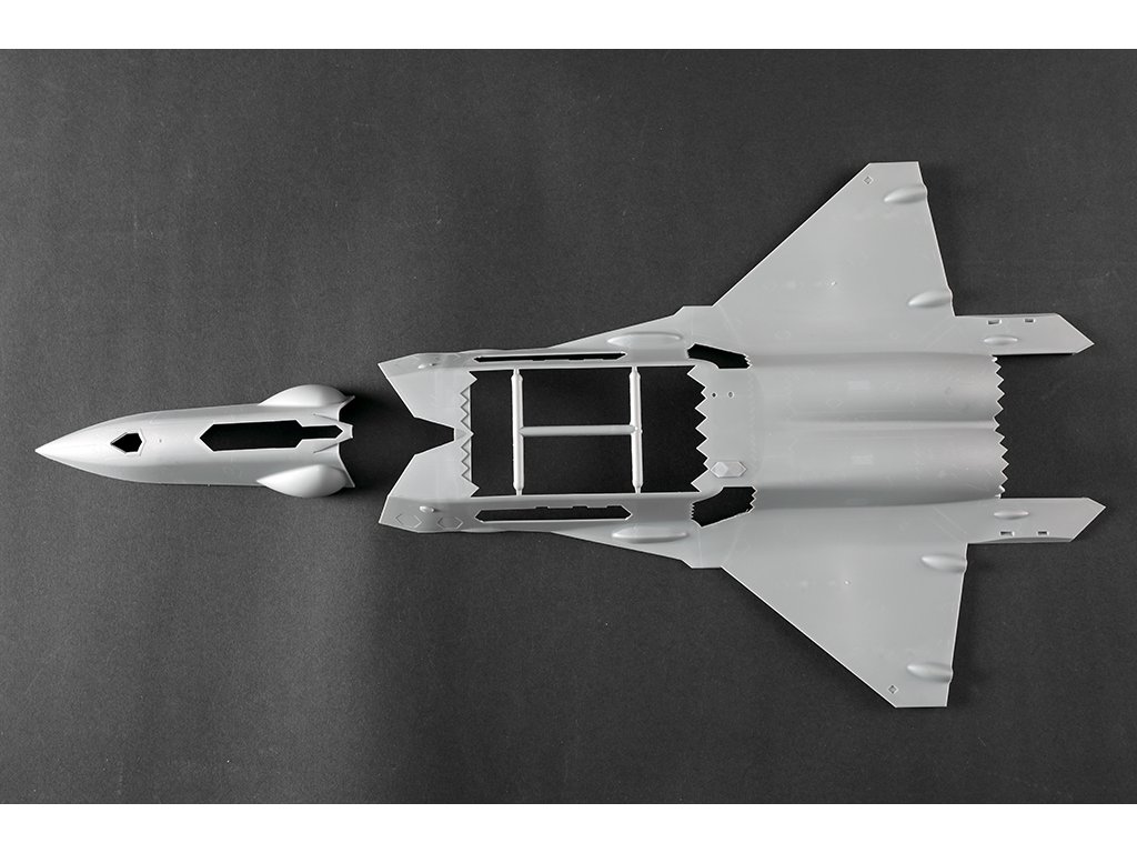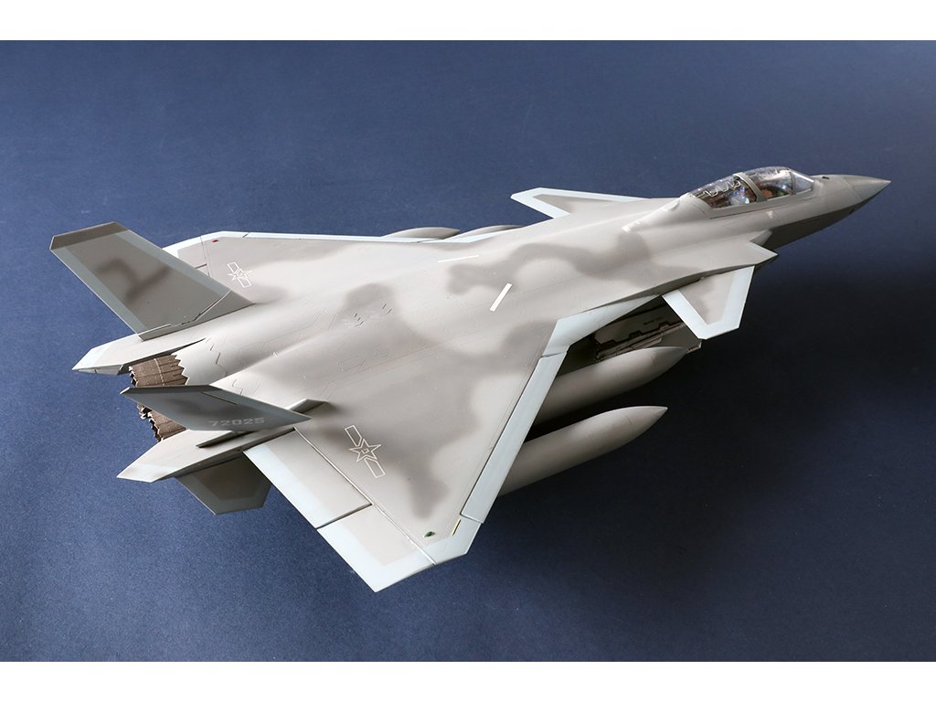 Stavebnice plastikového modelu čínského stealth jednomístného dvoumotorového stíhacího letadla ze současnosti.
