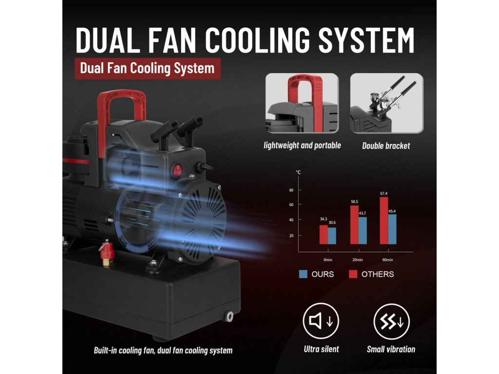 Pístový bezolejový kompresor. S tlakovou nádobou, regulátor výstupního tlaku, který je vybaven filtrem a manometrem. Nízká hlučnost během provozu. Díky nízké hmotnosti je přenosný a vhodný pro domácí a hobby použití. Tento kompresor je vhodný pro airbrush s tryskami 0,2 až 1 mm. Obsahuje dvojité chladící ventilátory umožňují dlouhodobý nepřetržitý provoz.