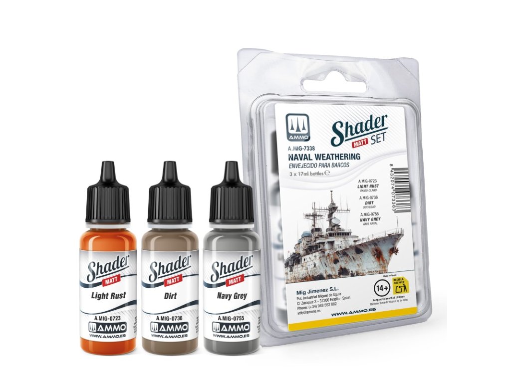 Sada akrylových barev Matt Shader určených k vytvoření realistických efektů povětrnostních vlivů na námořních modelech, příslušenství a diorámech.