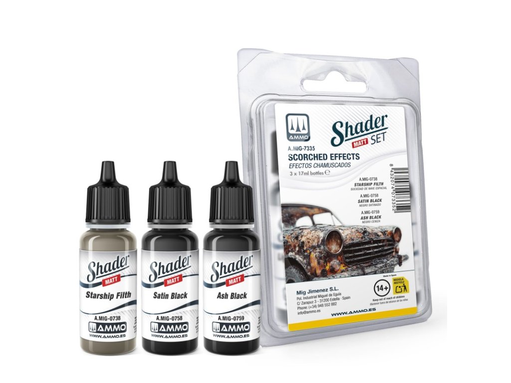 Sada akrylových barev Matt Shader určených k vytvoření realistických efektů spálení a ohoření na modelech, doplňcích a diorámech.