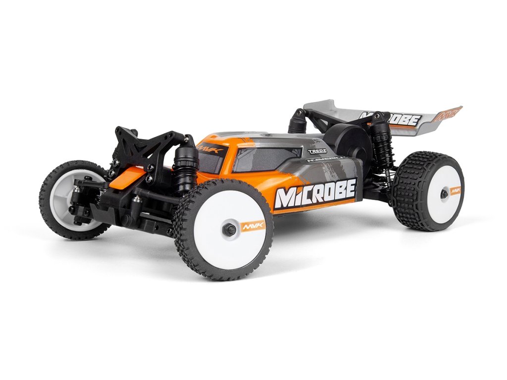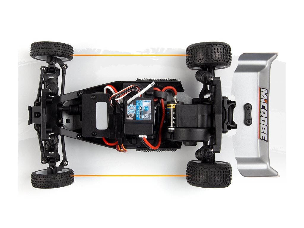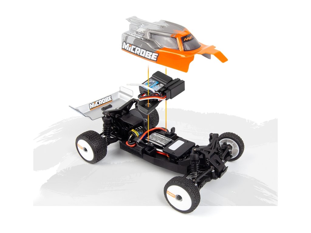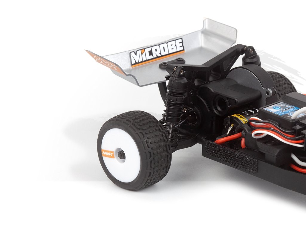 Elegantní 1,5 mm eloxované hliníkové plato podvozku, osazení kuličkovými ložisky a plynulá 3kolová zadní převodovka společně dodávají modelu Microbe stabilní a přesný pocit z jízdy. Přidejte olejové tlumiče a odvětrávaná kola s pěnovými vložkami a získáte malou buggy, která miluje zatáčky, pohlcuje nerovnosti a s jistotou vystřeluje ze zatáček.
