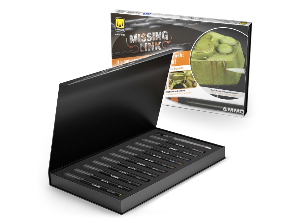 Missing Link jsou speciální weatheringové (patinovací) fixy na akrylové bázi, které kombinují štětec a fixu v jednom. Barevné odstíny fixů jsou transparentní, což umožňuje jemné vrstvení bez překrytí podkladové vrstvy barvy. Jsou ideální pro vytváření filtrů, stínů, imitaci nečistot a rzi, jakož i plynulých barevných přechodů či vytváření jemných linek. Odstíny lze mezi sebou míchat a kombinovat pomocí štětce namočeného ve vodě. Po zaschnutí se odstíny přirozeně integrují do natřeného povrchu díky svému polomatnému finiši. Každý fix má krytku, která zabraňuje jejímu odkutálení, jasné barevné označení a kompaktní velikost ideální pro skladování.