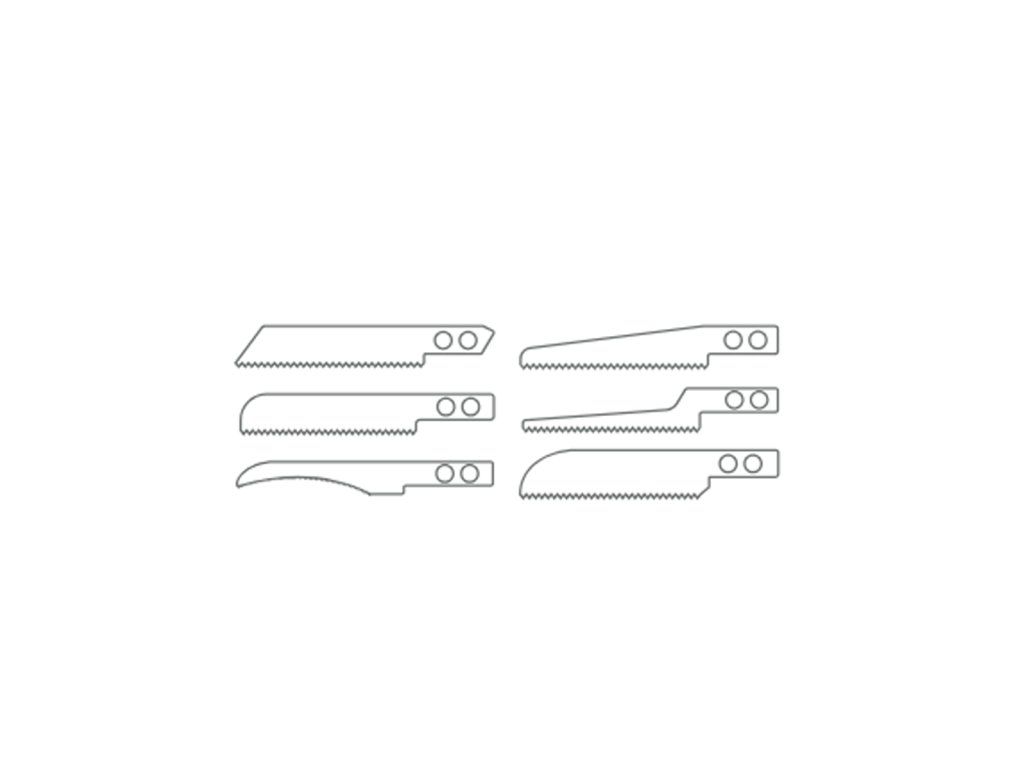Součástí balení je 6 různých pilových listů, pro jejichž výměnu jen jednoduše povolte šrouby upevňující rukojeť (pomocí přiloženého imbusového klíče), vyměňte list a utáhněte šrouby rukojeti.
