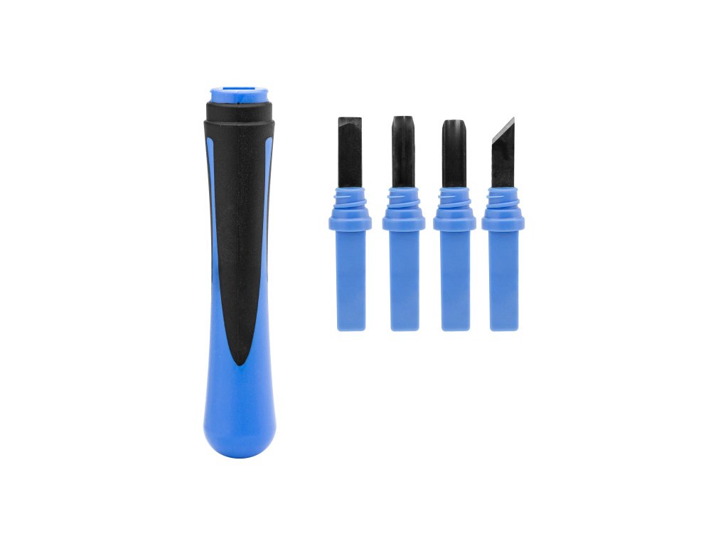 Obsah balení: Rukojeť, 4 dláta (šikmé dláto, V-dláto, ploché dláto, duté dláto).