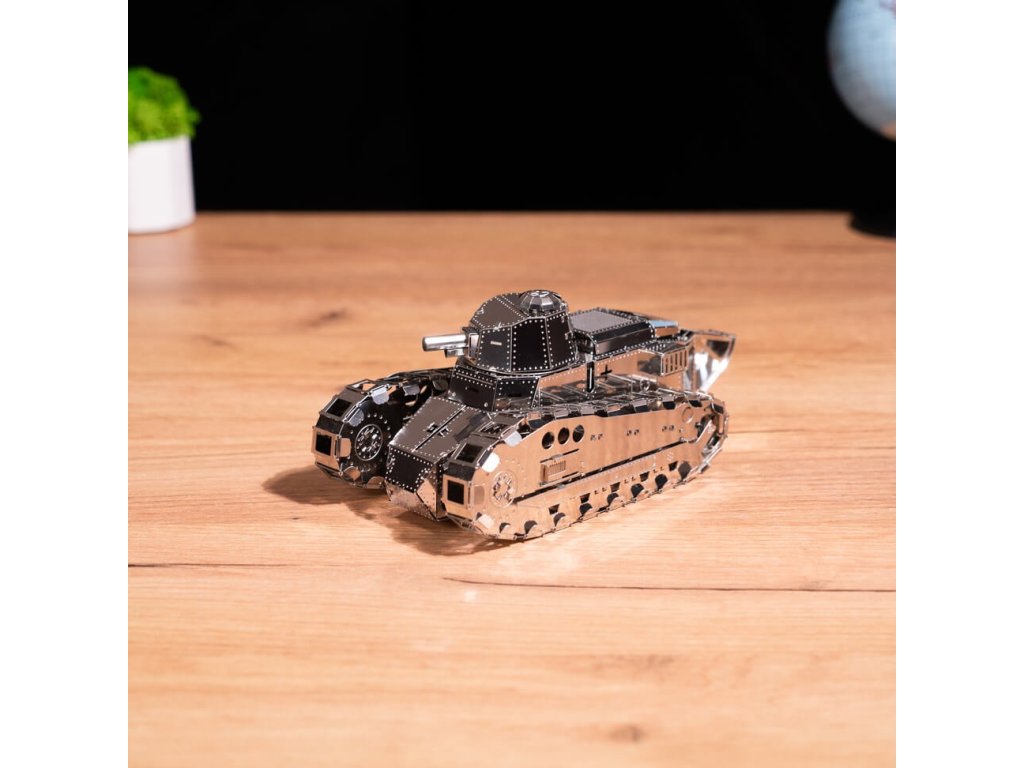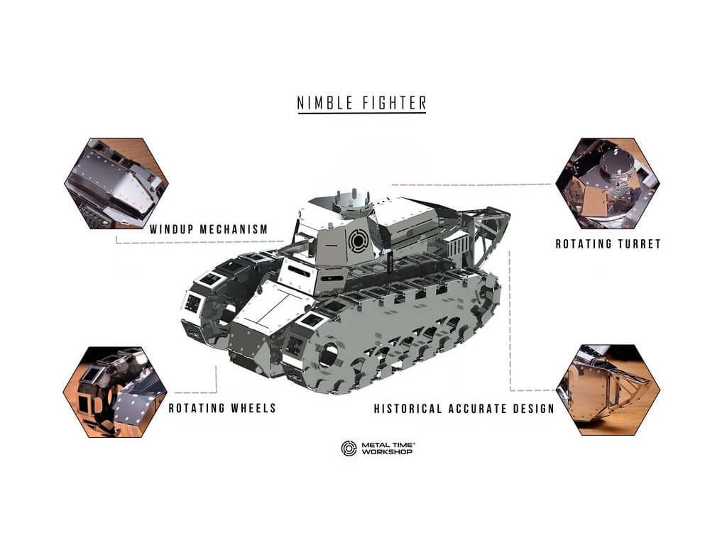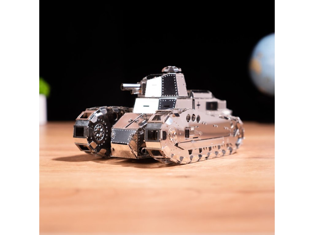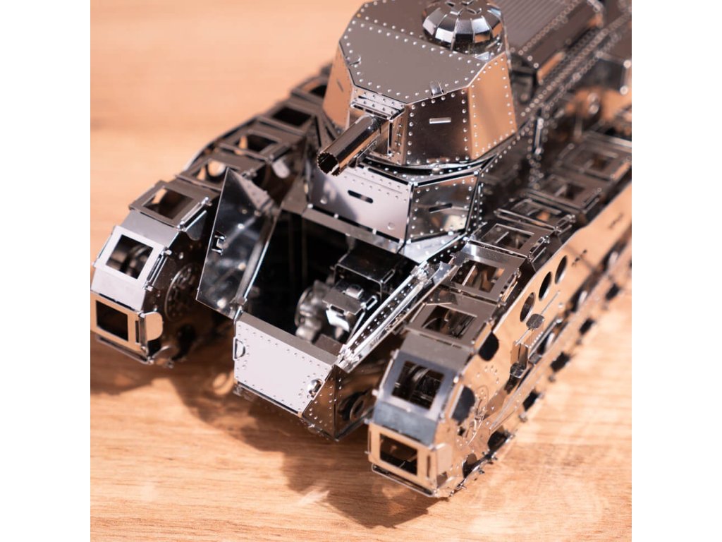 Stavebnice modelu z kovu. Vyrobeno z kvalitního leštěného ocelového plechu laserovým vypalováním a přesným obráběním. Vhodné pro mírně pokročilé a starší děti. Stavebnice obsahuje vyštipovací kleště, pilník, rukavice, čistící hadřík a sběratelské předměty jako odznak a nálepky.