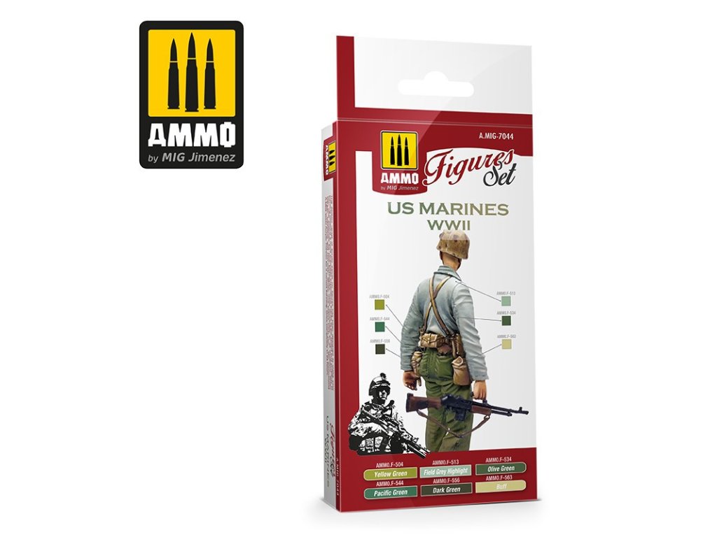 Sada modelářských akrylových barev značky Ammo určená pro nabarvení nebo nastříkání uniforem americké námořní pěchoty (mariňáci) v Tichomoří během druhé světové války.