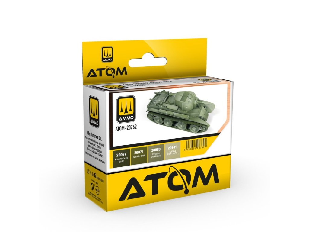 Sada vysoce kvalitních akrylových barev ATOM určená pro malování nebo nastříkání efektu modulace s kamuflážní barvou 4BO používanou Sovětským svazem během druhé světové války a po ní.