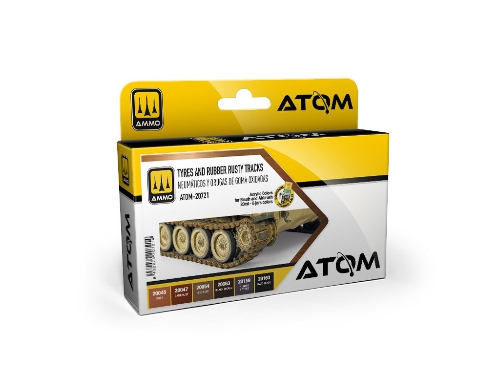 Nová revoluční série modelářských akrylových barev ATOM by AMMO, která spojuje 20 leté zkušenosti s barvami do jedné 20ml lahvičky. Barvy lze použít k malování a stříkání všech typů modelů nebo diorám, bez ohledu na jejich materiál, ať už je to plast, pryskyřice, fotolepty, kov, dřevo, pěna, tmel apod. Jsou ideální pro použití na modely, jako jsou vojenská vozidla, letadla, civilní vozidla, železniční modely, sci-fi, lodě, ponorky, diorámy, figurky, wargamingové a stolní hry a dokonce i modely na dálkové ovládání a autodráhová autíčka.