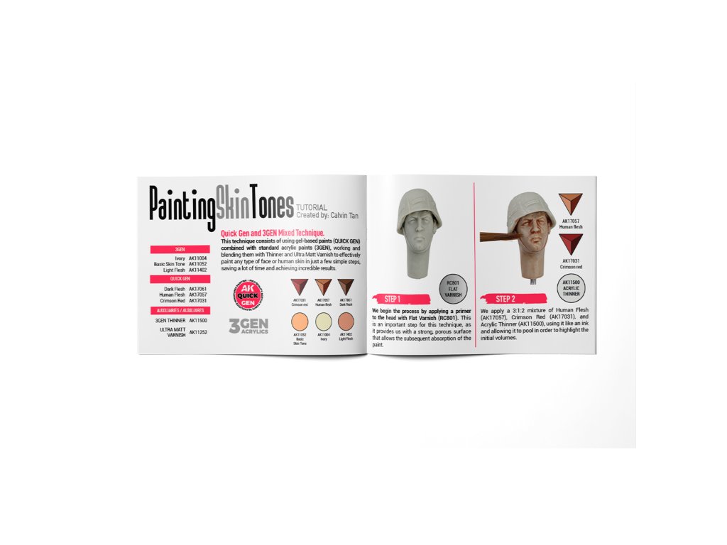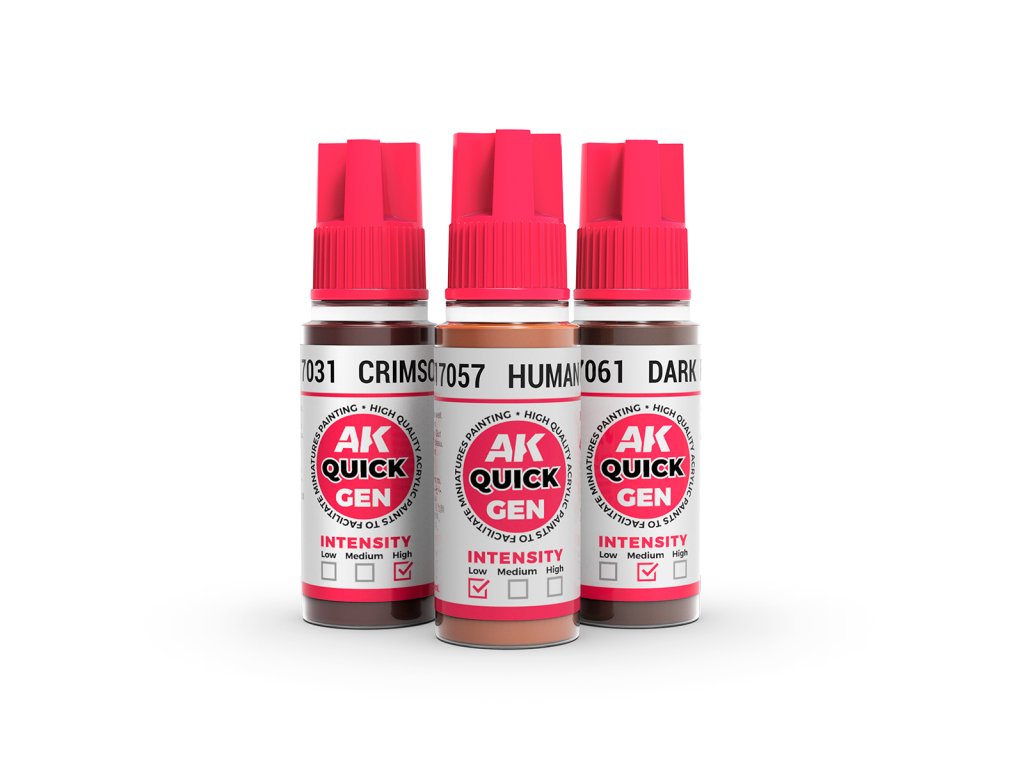 Sada akrylových barev AK-Interactive 3. generace a Quick GEN určená pro nabarvení nebo nastříkání pletí nebo tváří figurek. Součástí balení je i příručka „krok za krokem“, která vás provede přesným postupem od modeláře Calvina Tana.