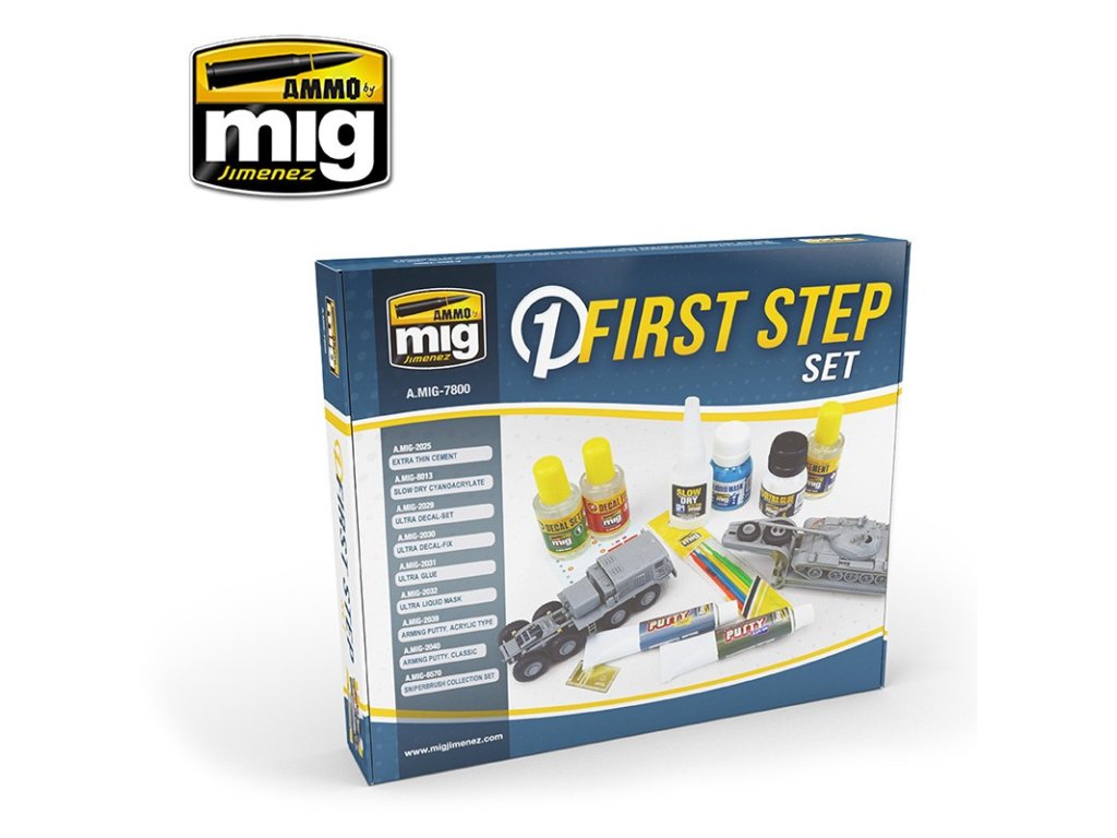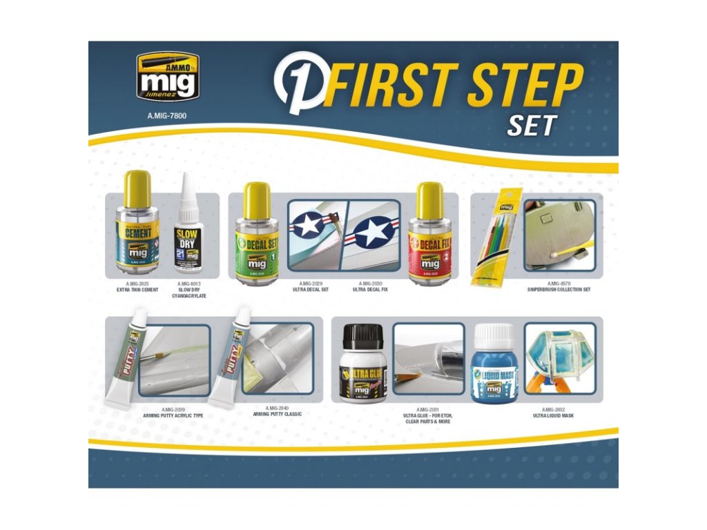 First Steps Set obsahuje všetky potrebné materiály pre lepenie, maskovanie a dekály na vaše modely, pre začiatočníkov aj skúsenejších modelárov. Tieto produkty ponúkajú najvyššiu kvalitu a jednoduchosť použitia, aby zabezpečili dokonalý povrch pri príprave stavebníc na proces povrchovej úpravy. Táto súprava obsahuje lepidlo na plast, akrylové lepidlo, kyanoakrylátové lepidlo, tmely, vodičky na dekály, tekutú masku a všestranný štetec.