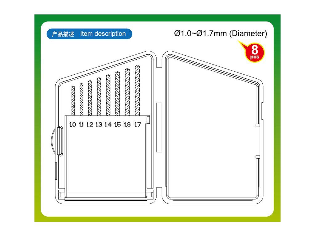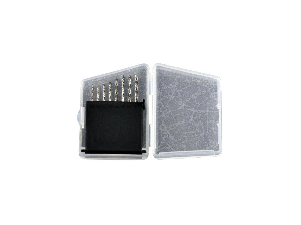 Sada modelářských/hobby vrtáků v plastovém obalu určeného k ochraně vrtáků před poškozením nebo ztrátou. Obsahuje 8 ks v rozměrech od 1,0 do 1,7mm