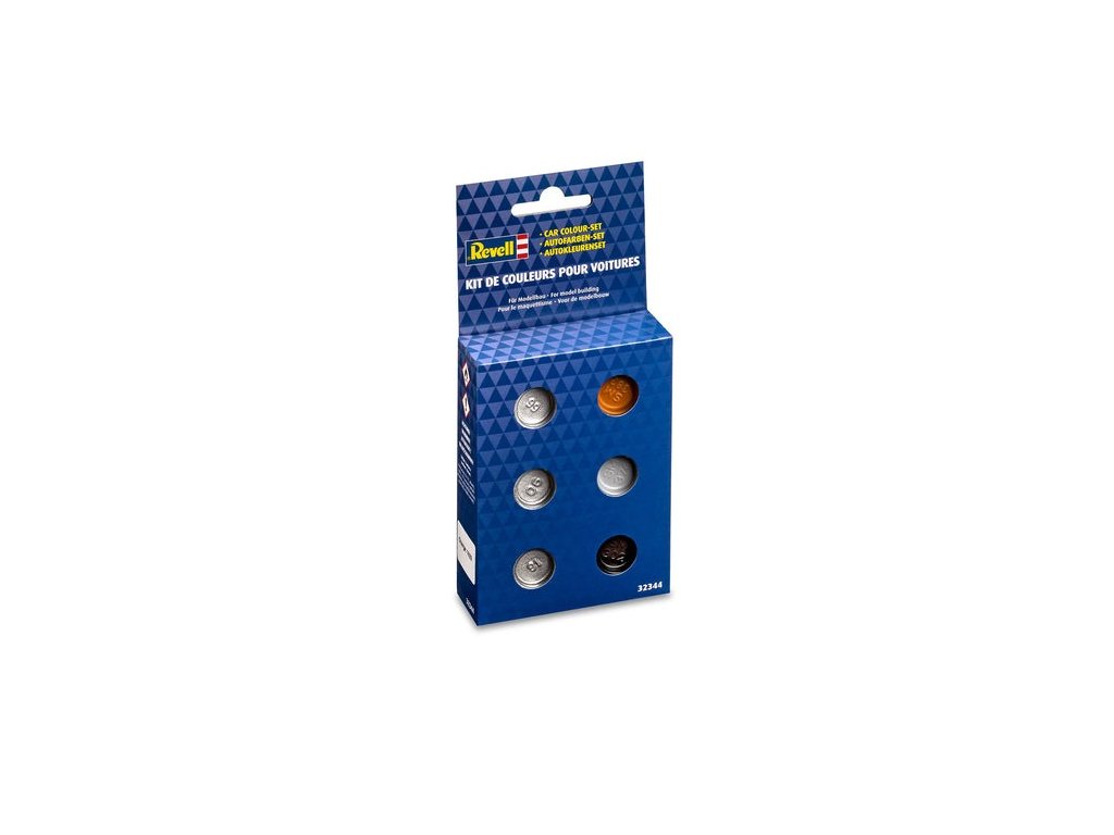 Sada syntetických barev Revell určená k nabarvení nebo nastříkání modelů automobilů.