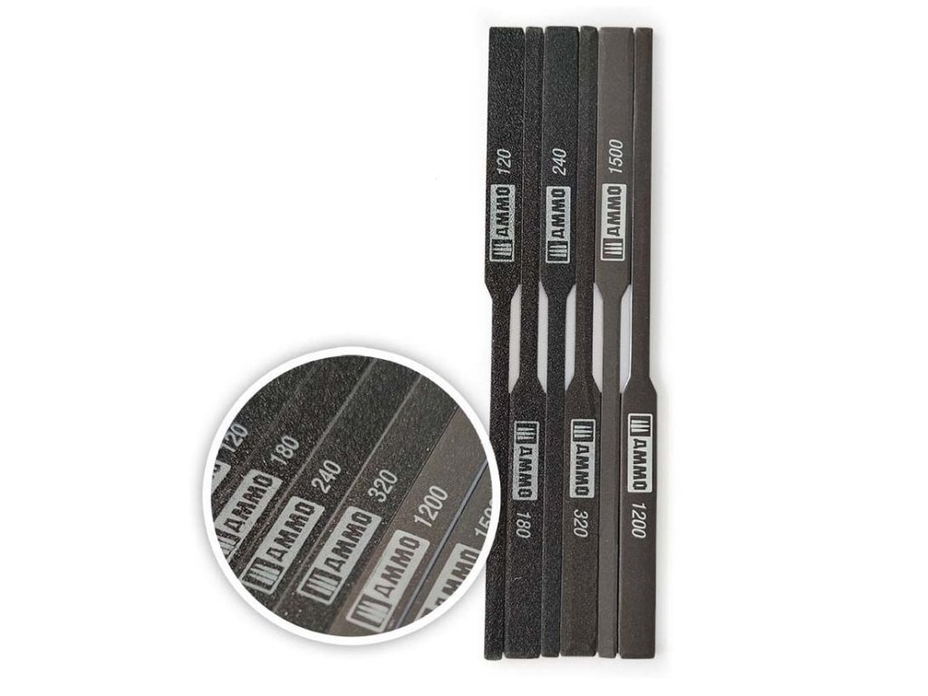 Balení obsahuje 6 brusných tyčinek o zrnitostech: 120/180/240/320/1200/1500.