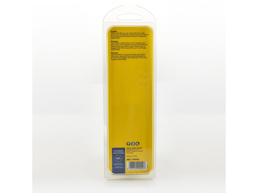 Sada tří oboustranných pilníků. Hrubý (60/100) pro odstranění materiálu, střední pro vyhlazení povrchu (240/400) a jemný pro finální leštění před aplikací barvy (600/1000).