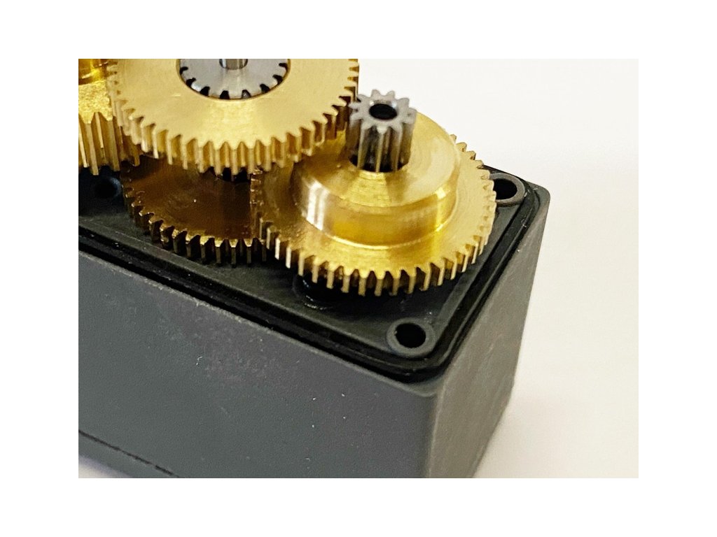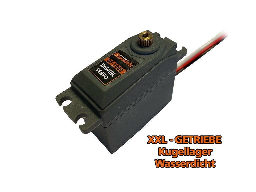 Nové digitálne servá DF-1000D od DF Models presvedčia nielen veľkým výkonom. Nová XXL prevodovka pravdepodobne prekonáva všetko, čo bolo doteraz v štandardných servoprevodovkách. Prevody sú cca o 1/3 - 1/2 väčšie a stabilnejšie dimenzované ako u štandardných serv (tejto triedy/veľkosti). Nápravy ozubených kolies sú uložené v kovových puzdrách, čo znižuje opotrebovanie a zaisťuje vždy presnú presnosť polohovania. Digitálne servá majú tiež guličkové ložiská a sú vodotesné.