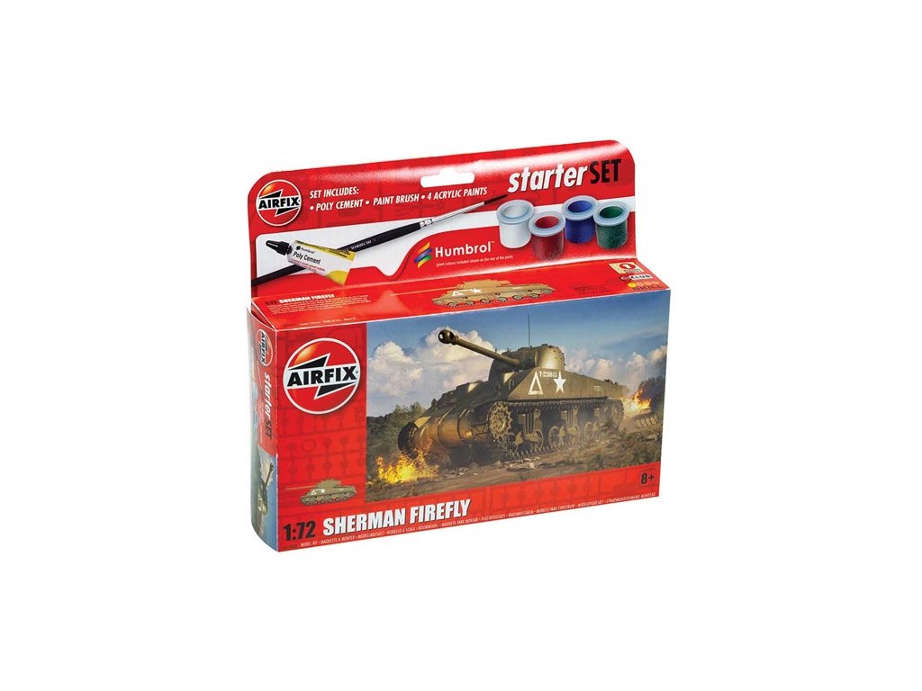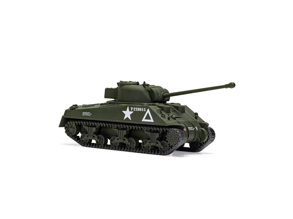 Začátečnická sada stavebnice plastikového modelu amerického tanku z 2. světové války obsahující i základní barvy, lepidlo a štětec.