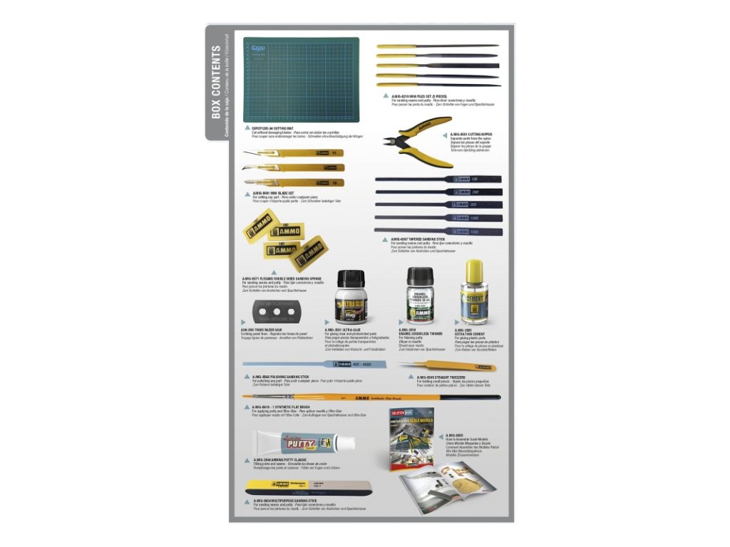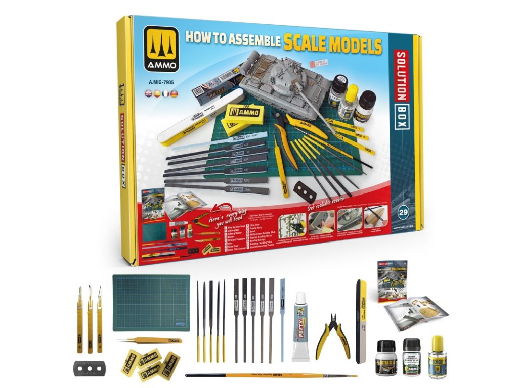 Sada Solution Box obsahující všechny potřebné nástroje a přípravky pro začínající nebo pokročilé modeláře. Sada obsahuje 56 stranovou příručku ve více jazycích (angličtina, španělština, francouzština a němčina) s podrobnými návody jak sestavit model.