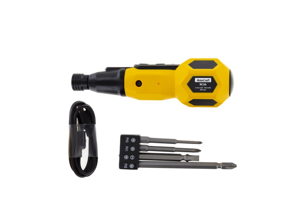 Obsah balení: Šroubovák, USB nabíjecí kabel, Sada tří křížových bitů a jednoho oboustranného bitu s plochou a křížovou hlavou.