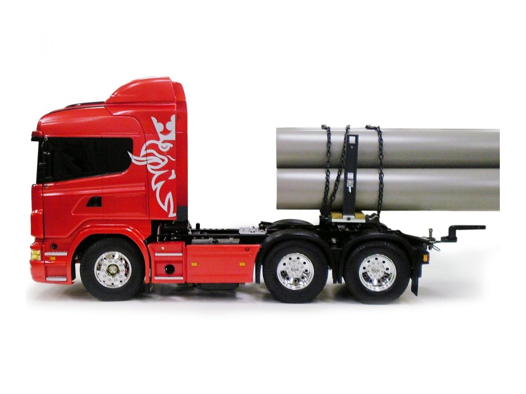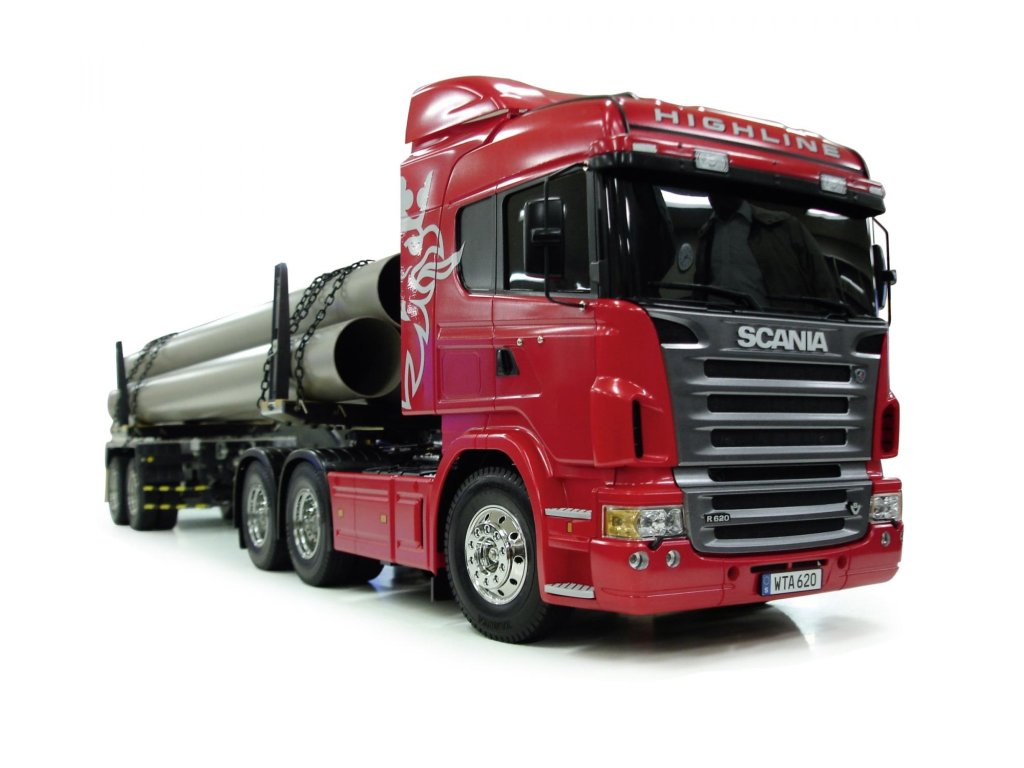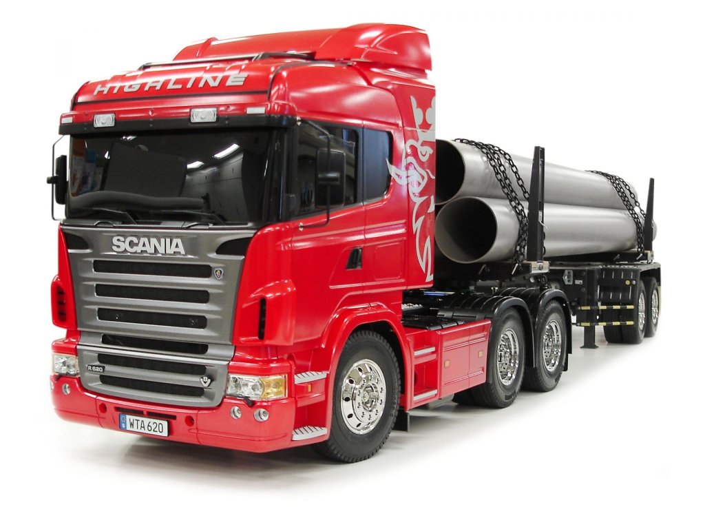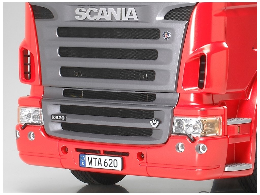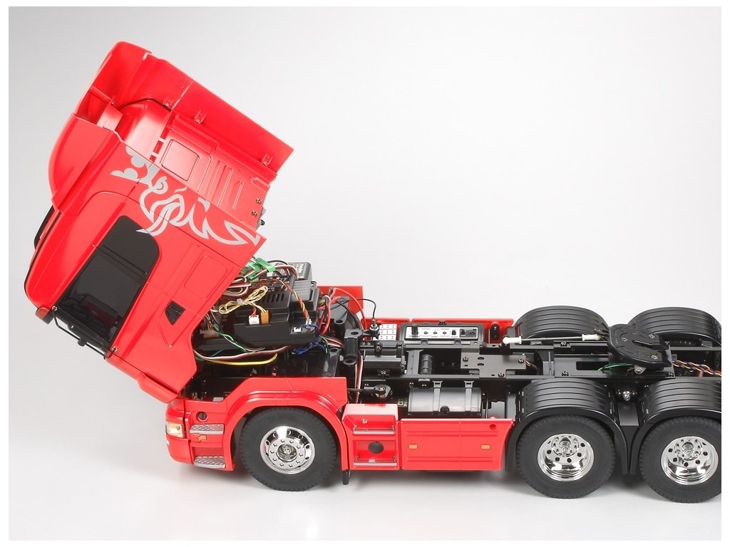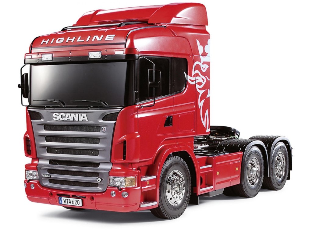 Náš test Scania R620: Tak jako všechny stavebnice značky Tamiya, i tato jen potvrzuje dobrou pověst tohoto japonského výrobce. Po vybalení rozměrné krabice zůstanou na stole rámečky s plastovými díly, několik sáčků s přehledně tříděnými šrouby, ozubenými koly a ostatními drobnostmi. Stavební návod je totálně přehledný, každý šroub je zřetelně zobrazen v životní velikosti, každý jeden krok je velmi přehledně zobrazen. Tento model však patří k těm složitějším a proto jej doporučuji pokročilejším modelářům. Zvláště proto, že nejdokonalejší je postaven is kompletní elektronikou MFC-03 Tamiya 56523 (ale lze samozřejmě rovněž použít MFC-01). Při dodržení návodu a systematickém postupu postavíte tento model v rámci několika večerů. Nejvíce práce je obvykle s kvalitním nastříkáním maketové karoserie a s montáží elektroniky. Toto obvykle trvá mnohem déle, než stavba šasi. Ke stavebnici je třeba dokoupit RC soupravu podle toho, zda model postavíte v nejjednodušším provedení, nebo v tom nejsložitějším. V prvním případě stačí obyčejná pistolová RC souprava a jedno servo řízení. V druhém případě použijete-li i MFC, je lepší koupit pákovou nejméně 4-kanálovou soupravu. Já jsem svůj model postavil v té nejvíce vybavené verzi a použil jsem proto dvě voděodolná serva Carson 6kg a vysílač Carson Reflex 6k. Konstrukce šasi modelů tahačů Tamiya je v podstatě stejná ve všech typech, ať už je to King Hauler, nebo Scania. Základem šasi je rám tvořen dvěma nosníky spojenými několika příčníky. K rámu se připojují závěsy náprav, tlumiče, lůžka serv a nakonec převodovka s motorem. Všechny spoje jsou šroubovány a proto není problém pokud si model nejprve postavíte v nejjednodušším provedení a pokročilou elektroniku domontujete později. Vše lze pěkně rozebrat bez poškození. Jelikož já jsem do svého modelu namontoval i MFC-01 Tamiya (POZOR, kupuje se samostatně), mám v modelu všechna světla a zvuky naprosto realistické, včetně zvláště efektního zvuku motoru a klaksonu. Model má 3 rychlostní převodovku. To znamená, že lze ručně nebo dálkově zvolit jeden ze tří převodových poměrů a tím výrazně změnit točivý moment na nápravách, případně rozsah rychlostí podle velikosti nákladu. Prostor pro baterii je ze spodní strany šasi v dobře přístupné schránce. Je to model, se kterým lze běžně jezdit venku, ale pozor, MFC-03 (MFC-01) není vodotěsná. Naštěstí na tohle je poměrně snadná pomoc, stačí opatrně otevřít schránku MFC, a nastříkat elektroniku přípravkem Nanoprotech. Servo a přijímač je třeba hned na začátku vybírat s požadavkem voděodolnosti nebo i vodotěsnosti. Když to shrnu, koupí této stavebnice dostanete několik hodin perfektní zábavy ukončené radostí z atraktivního modelu výborného pro nadšence kamiony. Pokud si k němu dokoupíte ještě některý z široké nabídky návěsů, budete mít doma takovou atrakci, jakou se budete rádi pyšnit před každou návštěvou. Ostatně, na videu se o výkonech modelů tahačů Tamiya můžete sami přesvědčit.