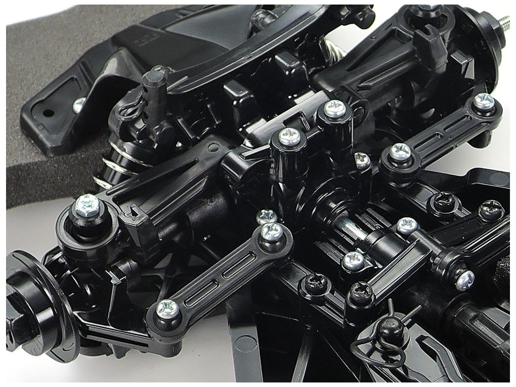Šasi Tamiya TT-02. Pohon 4x4 je zajištěn středovým kardanem spojujícím diferenciály přední a zadní nápravy. Výborná stabilita je zajištěna umístěním akumulátoru v podélné ose vedle středového kardanu. Motor je umístěn před zadní nápravou, což ještě více zlepšuje jízdní vlastnosti.