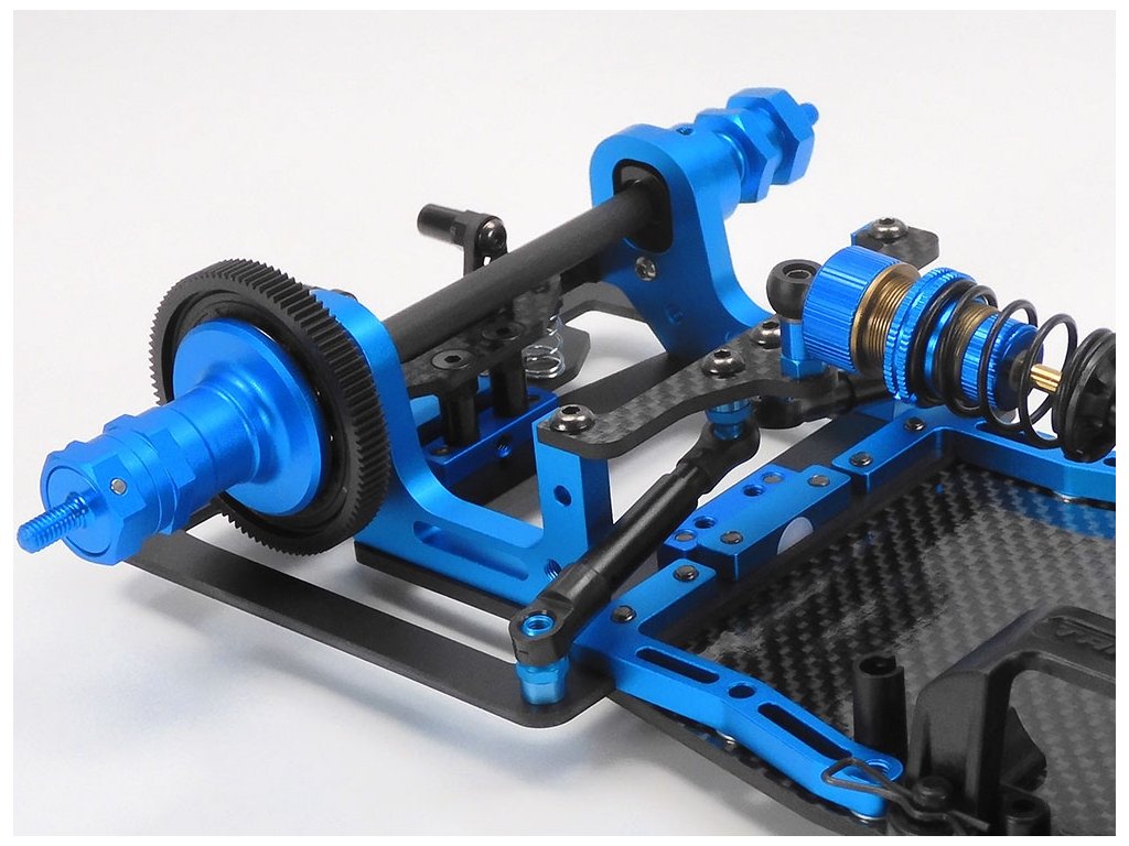 Zadní kuličkový diferenciál je stejný jako ten, který se používá pro podvozek TRF103. Lehký a odolný hřídel z uhlíkových vláken omezuje hmotnost a zajišťuje kompatibilitu s gumovými pneumatikami, které jsou relativně obtížné.
