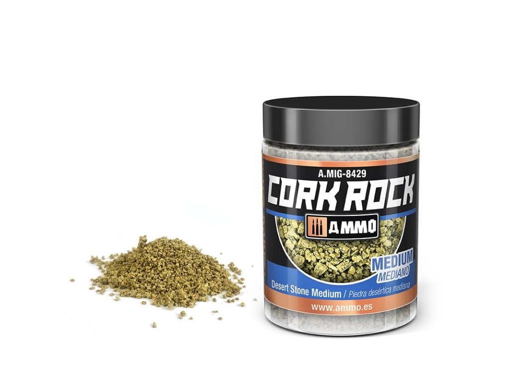 Vysokokvalitný korkový granulát sfarbený do pieskovej farby, ktorý predstavuje kamene a sutiny v púštnych oblastiach. K dispozícii v troch rôznych veľkostiach alebo v kombinácii troch veľkostí, aby lepšie vyhovoval potrebám každého modelára. Pripravené na použitie priamo z balenia. Drvené korkové dieliky možno pripevniť pomocou všetkých druhov lepidiel, vrátane akrylových aj kyanoakrylátových lepidiel.