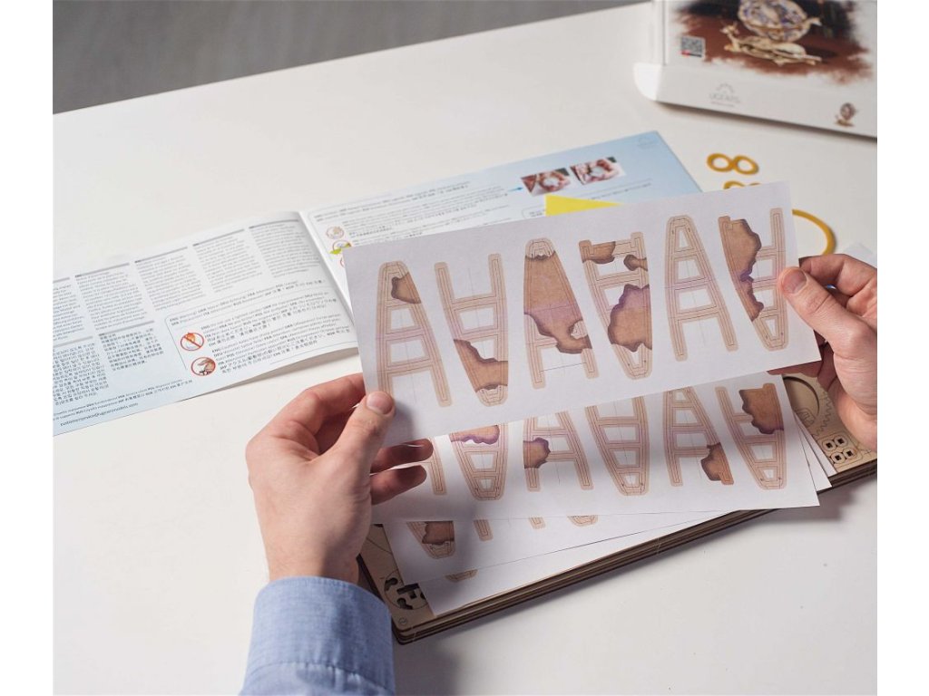 Jednotlivé díly opatrně vyjměte z nosné desky vždy až před použitím. Pro oddělení od rámečku použijte ostrý nůž, jen pro proříznutí tenké spojky držící díl v desce. Po obvodu dílu můžete lehce proběhnout brusidlem, abyste očistili hranu od spáleného povrchu (následek vypalování laserem). Díly zasouvejte do sebe podle jednotlivých kroků v návodu. Použití lepidla není nutné, ale chcete-li mít model trvale sestavený, můžete díly k sobě i slepit malým množstvím modelářského lepidla na dřevo.
