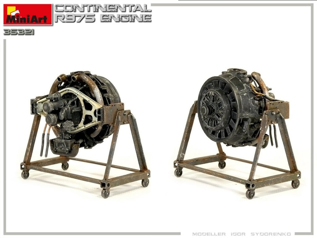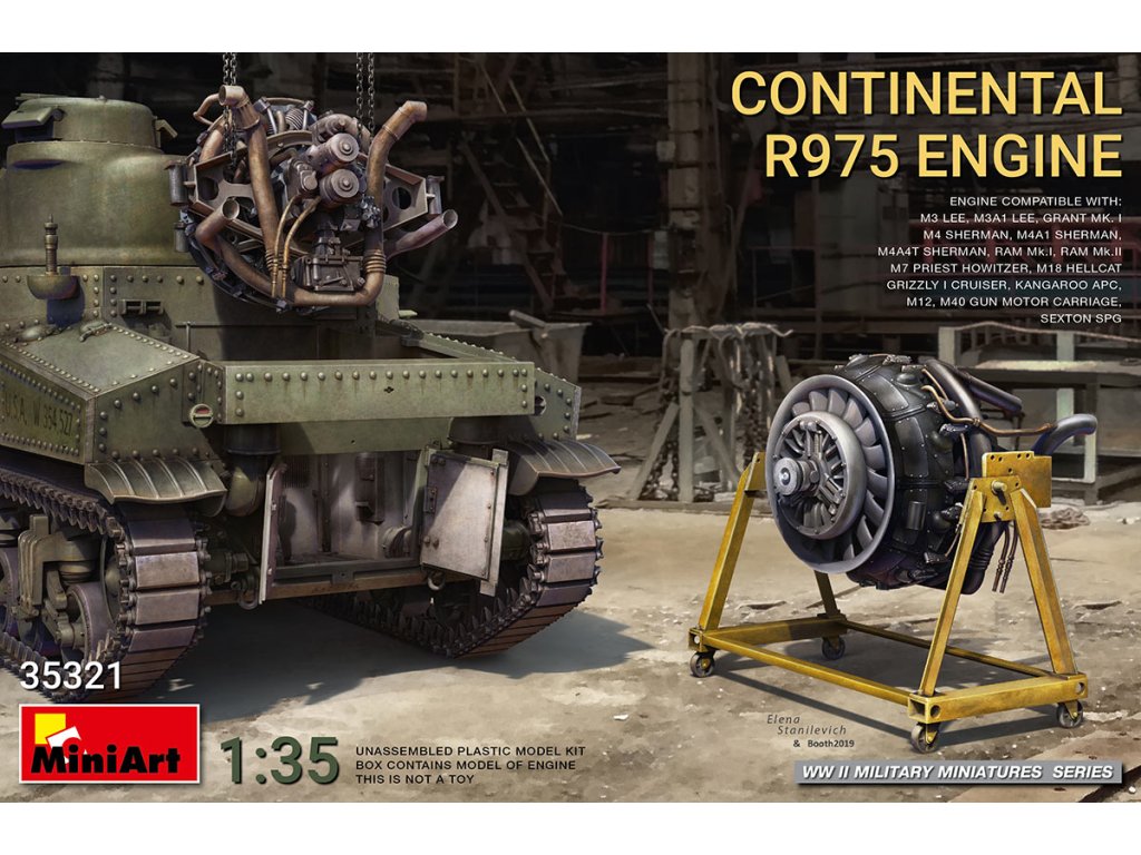 Stavebnice plastikového modelu amerického 9-válcového hvězdicového benzinového motoru používaného v obrněných vojenských vozidlech a tancích (např. M3 Lee / Grant, M4 Sherman, M18 Hellcat apod.) během 2. světové války.