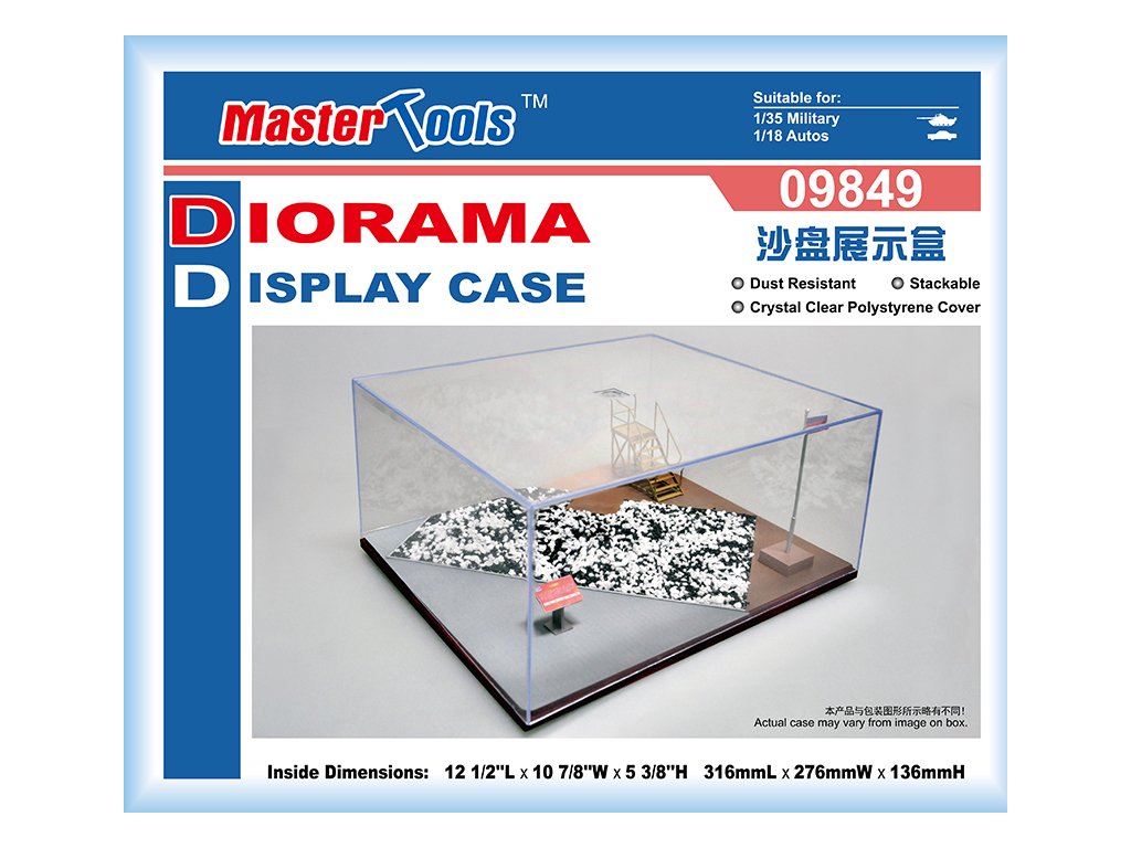 Plastová krabice určená pro vystavení modelu nebo malé diorámy. Podstavec je zakryt kvalitním průhledným plastovým krytem. Pozor, není odolný proti poškrábání. Určeno pro modely v měřítkách 1/35 a 1/18. Součástí balení jsou také plastové díly.